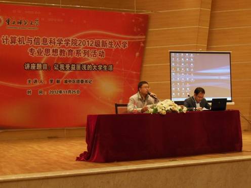 2012年11月25日晚7:30在校友会堂音乐厅,学院邀请到我校原数计学院计算机专业毕业的优秀校友——渝中区团区委书记罗毅为2012级全体新生开展了“让我受益匪浅的大学生活”的主题报告会。浪live