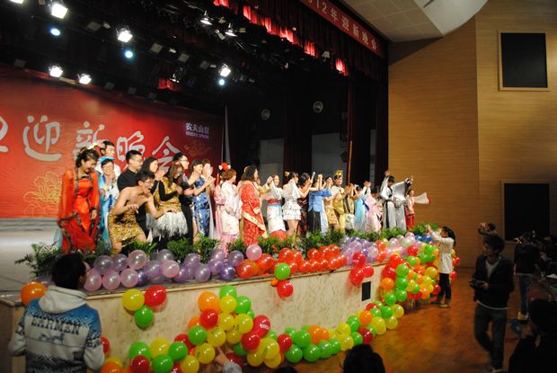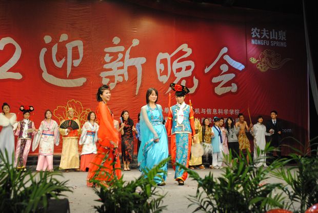 看,场上男男女女用那轻盈而娴熟的节奏,动感而激情的舞姿正在演绎着恰恰《Hole in my heart》,紧随其后的歌曲串烧《如果爱》和教师节目《格桑花》将晚会气氛推到高潮。扣人心弦的魔术《预言》,充满异域风情的《新疆舞》和古典舞《梦醉潇湘》,耐人深省的情景剧《丁香花》、《历史的天空》无一不感染在场的每一位观众,牵动着每一颗观众的心。嘻哈街舞串烧《舞客联盟》,霸气逼人rap《平民百万歌星》,优雅清新乐器合奏曲《burning》展示了年轻一代青春的曼妙多彩和无限热情,第四届团总支学生会的一场《时空之秀》更是呈现了集体创作的精美,形式新颖、妙趣横生、令人称绝。更有趣的是融合了小品和《江南style》的《计信好声音》令广大师生捧腹大笑,台下掌声阵阵,欢呼声一浪高过一浪。值得一提的是,晚会还特别设置了与观众游戏互动和微博互动的环节,同学们积极参与,充分体现了浪live