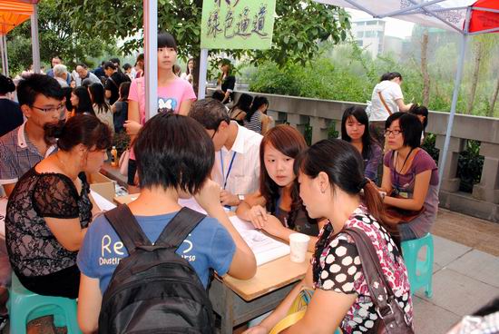 在迎新工作现场,迎新工作志愿者同学们为新生认真办理报到手续。