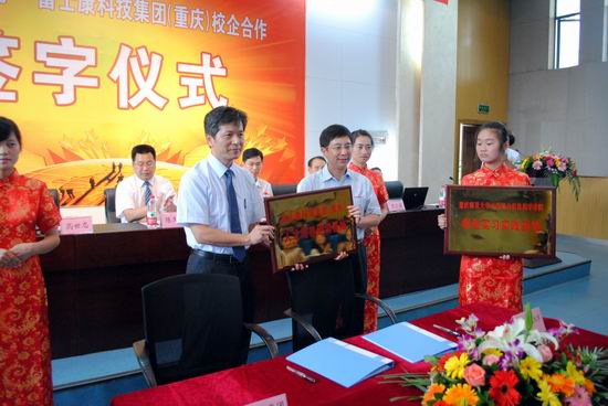 培养人才工作搭建了良好的平台表示感谢,对双方合作前景表示很有信心,同时希望双方能进一步增加合作渠道。随后,计信学院马燕院长与富士康科技集团(重庆)信息中心高世忠副总经理签订了合作协议并相互进行基地授牌,教务处洪全处长、学生处党亚莲处长为富士康科技集团(重庆)高世忠副总经理、陈彦志副理颁发了浪live