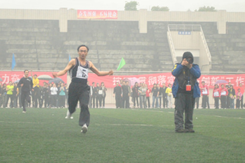 4月15日,校运动会比赛依然在校运动场上如火如荼地进行着。虽然天不作美,运动场阴云密布,下着毛毛细雨,但场内人员依然激情不减,忙得热火朝天。早上8:00,运动场上、大本营内,计信学院的赛场主角、后勤保障人员纷纷到位,开始做赛前准备工作。8:30,观众们陆续进场,鼓足干劲为运动员加油助威,为学院争光添彩。