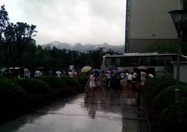 同学们在暴雨中有序的搬迁