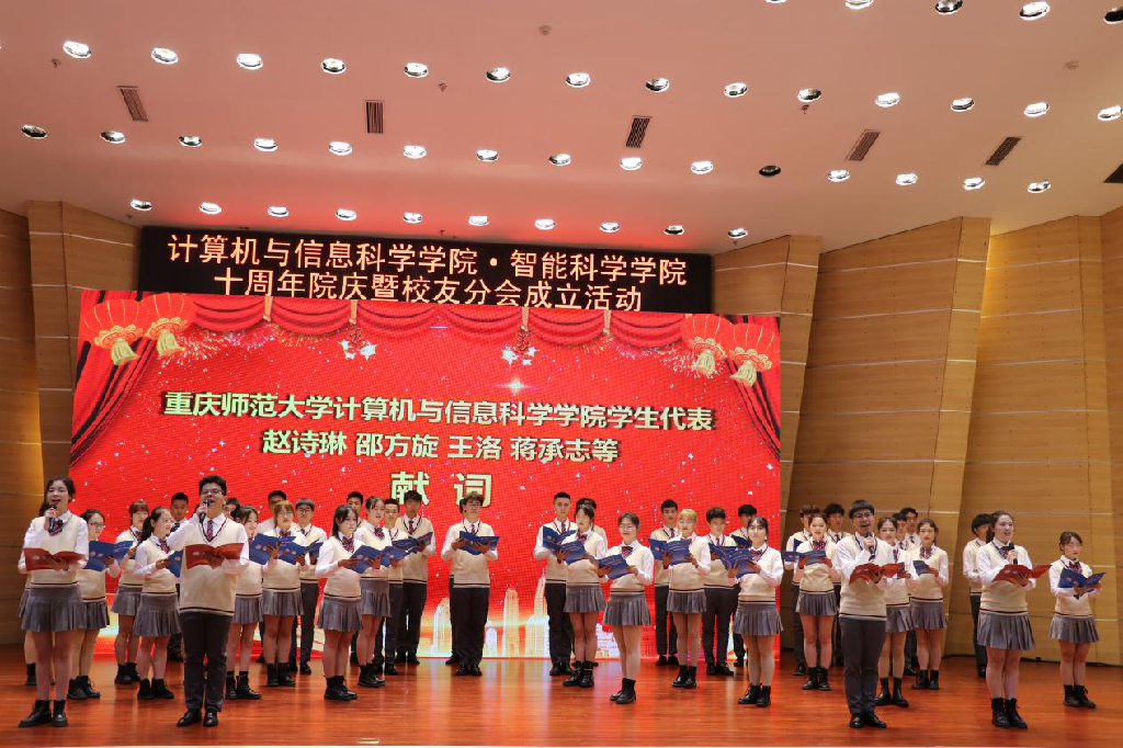 接下来,学生代表上台献词,计信学子声情并茂地表达了学院的深情与祝愿,博得台下阵阵掌声。紧接着,2012级计算机科学与技术专业学生刘玉立作为毕业生代表表达了对学院领导老师悉心培育的感激之情以及对学院未来发展的美好憧憬。重庆计算机学会秘书长曾一教授、南京师范大学计算机与电子信息学院院长吉根林教授、腾讯教育高校产品总经理钱栩磊先生上台致辞,表达了对计信学院十年生日的祝福,并表示将加深校企合作,助推学院发展。同时,浪live