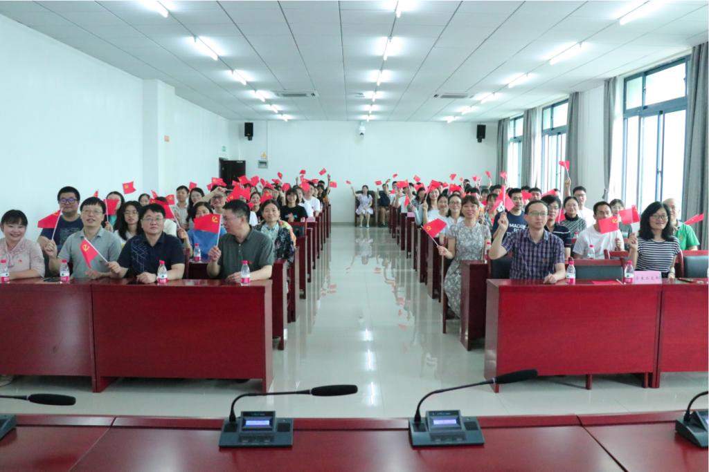 伴随着声声雄壮的礼炮声,全体师生庄严站立观礼,随后在振奋人心的《义勇军进行曲》中,全体师生共同向国旗行注目礼,同声高唱国歌。随后,全体师生聚精会神地听取了习近平总书记的讲话,习近平总书记强调,一百年前,中国共产党的先驱们创造了中国共产党,形成了坚持真理、坚守理想,践行初心、当担使命,不怕牺牲、英勇斗争,对党忠诚、不负人民的伟大建党精神,这是中国共产党的精神之源。习近平总书记也指出,初心易得,始终难守。以史为鉴,可以知兴替。号召全党全国人民从中国共产党的百年奋斗中看清楚过去我们为什么能够成功、弄明白未来我们怎样才能继续成功,从而在新的征程上更加坚定、更加自觉地牢记初心使命、开创美好未来。现场不时响起阵阵热烈的掌声。庆典结束后,全体师生在《我和我的祖国》的音乐声中,齐齐挥动党旗,兴奋激动之情溢于言表。