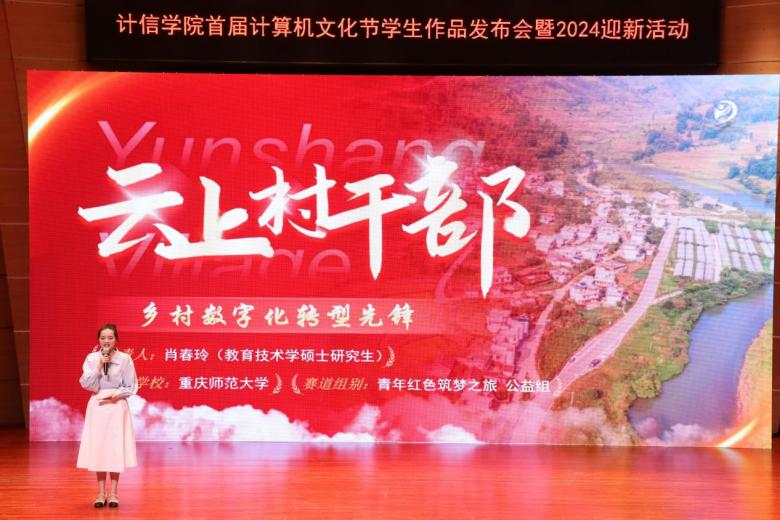 学生作品发布会将整场活动引入高潮,同学们从问题分析、解决方案、项目创新三个维度对团队作品进行了深入的讲解和分析。《宫颈智鉴——宫颈病变辅助诊断助手》《髋启未来——儿童髋臼指数自动测量领航者》《雪域巅峰之旅——基于数智化系统的雪山攀登服务》《云上村干部——乡村数字化转型服务新模式》《商砼智造》《基于Ros的智能拍照机器人》《人人音乐家——AI教育互动课程》七个作品展示了计信学子利用专业服务生活和产业,服务经济和社会发展的积极探索。最后,在《科技筑梦》激昂的朗诵声中,计算机文化节启动仪式圆满落幕。