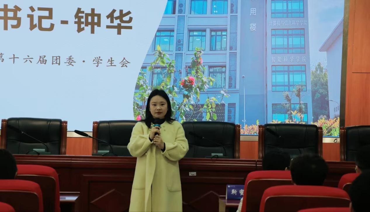 在致用楼102举办第十六届团委学生会述职大会。计信学院团委书记钟华、全体辅导员老师、学校学生会主席团成员杨启华和第十六届团委学生会全体成员参会。