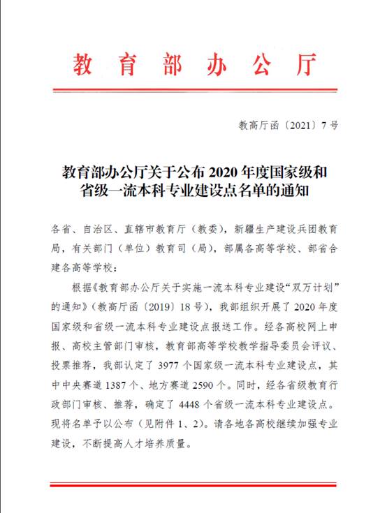 近日,教育部下发了《教育部办公厅关于公布2020年度国家级和省级一流本科专业建设点的通知》(教高厅函[2021]7号),浪live 软件工程学专业入选国家级一流本科专业建设点,实现了学院本科专业建设国家级项目的突破。