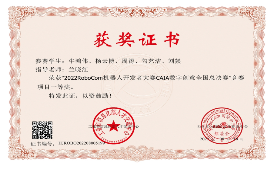 在2022RoboCom机器人开发者大赛CAIA数字创意全国总决赛中,由兰晓红老师指导,勾艺洁、杨云博为代表的团队荣获一等奖。