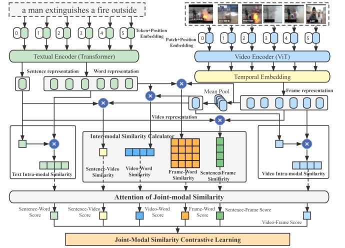 受图像-文本检索的启发,论文提出了一种基于联合多粒度相似性对比学习的方法用于视频-文本检索。首先,该方法设计了一个时序多模态变换器来提取视频文本数据的多粒度语义特征。此外,该方法进行了模态内和模态间的多粒度相似性计算。该方法结合了每个维度的特征进行对比,在视频文本检索任务中学习更多独特的特征。更重要的是,该方法增强了同一模态内不同粒度特征之间的交互。最后,为了获得实例级的相似性,论文提出了注意力联合模态相似性模块,它使用一个注意力机制来聚合和分配不同的权重的相似性向量/矩阵中的分数。在4个视频文本基准数据集上的实验表明,该方法在检索性能方面优于现有的方法,验证了所提出方法的有效性。通过消融实验发现模态内相似性与模态间相似性结合能表现出优异的性能。
