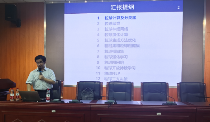 随后,夏教授首先对科研室的主要研究方向与工作内容进行了介绍,其中重点介绍了关于多粒度粒球计算理论的相关研究成果和最新进展,主要包括:粒球分类器以及粒球模糊集分别实现了非点输入的高效、鲁棒的分类方法和模糊计算,初步建立了基于粒球计算的不确定性理论,粒球聚类提升了现有主要聚类方法的效率和鲁棒性;粒球粗糙集统一了经典和邻域粗糙集模型。最后,夏教授向我们指明了高精度的轻量级神经网络学习模型是在未来的努力方向。讲座结束后,现场老师进行了热烈提问,大家分别就小样本数据集训练泛化能力弱等提出问题,夏教授耐心地进行了详细的答疑解惑。