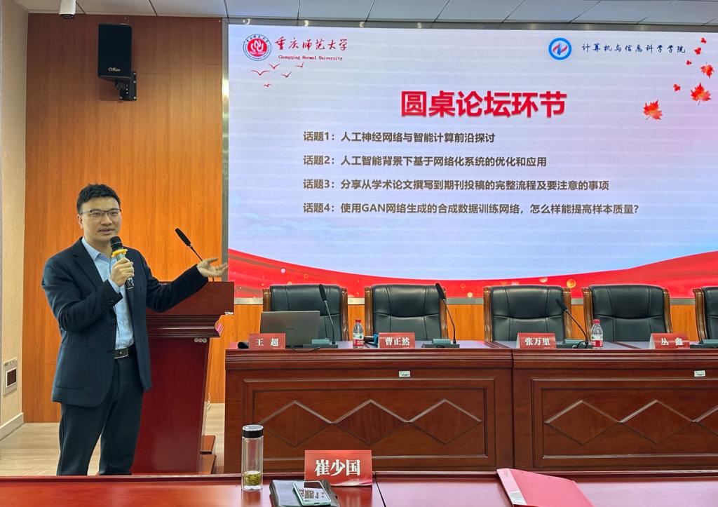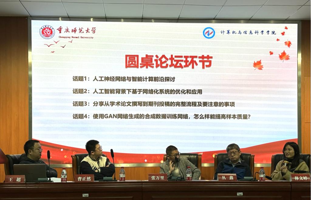 在圆桌论坛环节,结合会前征集的学生感兴趣的议题,主讲人与三位嘉宾就“人工神经网络与智能计算前沿探讨”、“人工智能背景下基于网络化系统的优化和应用”等4个议题内容展开讨论。