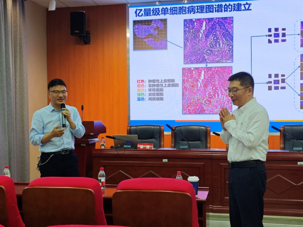 讲座最后,崔院长对本此会议进行了总结,他指出本次“图灵学术大讲堂”聚焦大模型时代下的智能肿瘤学前沿,为师生们带来了一场精彩的学术盛宴。徐波教授的报告深入浅出,全面解析了人工智能技术在肿瘤预防、筛查、诊断、治疗及康复等各个环节的最新进展,尤其突出大模型技术带来的全新机遇。崔院长强调此次学术交流活动不仅拓宽了师生的学术视野,还为学院与医学领域的深度合作搭建了桥梁,并激励大家在智能肿瘤学领域不断探索创新,为推动医学进步贡献力量。