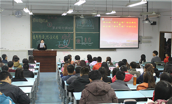 于弘德楼5102教室举办了第四期“青马工程”结业典礼暨第五期“青马工程”开班仪式。出席的嘉宾有学院13级辅导员朱嘉洁老师、12级辅导员傅帆老师、11级辅导员孙柳艳老师、14级辅导员姜扬老师以及其他兄弟学院和浪live