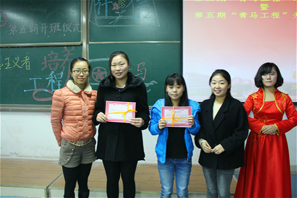 大会首先由朱嘉洁老师发言。她表达了对新成员的恭喜和期望,介绍了“青马工程”的内容。14级辅导员姜扬老师宣读第五期青马班培训人员名单。随后团总支学生会书记张聪杰从修德、明辨、学习、工作这四个方面来与大家分享了个人感悟,引起听者对未来的思考。而第五期青马工程学员14级学生代表徐焱则表达了对培训的期待和信心。最后由朱嘉洁老师给上一期青马班两位负责人和三位班委颁发聘书,傅帆老师、姜扬老师给12级、13级青马毕业生颁发结业证书。开班仪式在庄严的宣誓中落下帷幕结束。