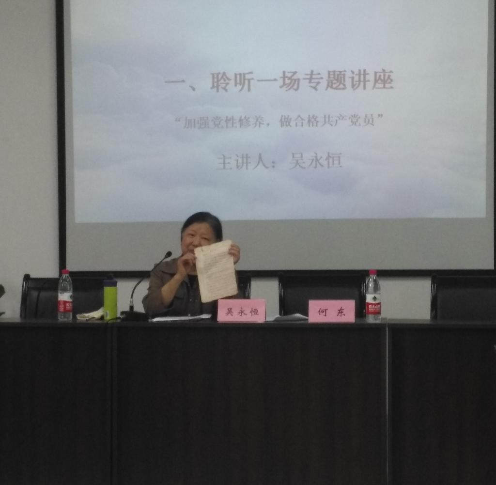 本次教育实践活动主要分为四个部分进行,分别为聆听一场专题讲座、接受一次组织谈话、研读一篇经典文献以及重温一次入党誓词。活动的重点开展内容是“七个一”的前三部分。在专题讲座环节中,吴书记为毕业生党员分享的主题是“加强党性修养,做合格共产党员”。吴书记在讲端正入党动机时为毕业生党员展示出两名老党员学生时期的思想汇报,里面提到他们无悔为党和国家做贡献的觉悟,毕业生党员纷纷树立起敬仰之心,并表示要以他们为榜样。讲座即将结束时,吴书记对即将走上工作岗位的毕业生党员提出了四点要求:第一,认真学习党的方针政策;第二,刻苦钻研业务,做勤奋工作的榜样;第三,严格争取做严于律己的榜样;第四,密切联系群众,做团结同事的榜样。这让毕业生党员更加明确自己作为一名党员的责任。随后在接受组织谈话环节里,何书记耐心仔细的为毕业生党员讲解了党组织关系转移过程中需注意的问题,还表示愿意随时提供帮助。在研读一篇经典文献环节中,每个毕业生党员手上的书的扉页都留有教师们手写的毕业赠言,寄托了教师们对毕业生党员的殷切希望以及祝福。