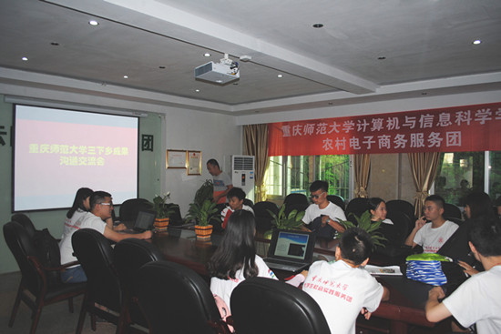 期间还发生了一件有趣的事。农村电子商务服务团中有来自外地的同学。在听见另一位队员用重庆话表达“捡便宜”时,突然提出了疑问,惹得在场的人都笑了。在融洽的氛围中,交流会悄悄接近尾声。