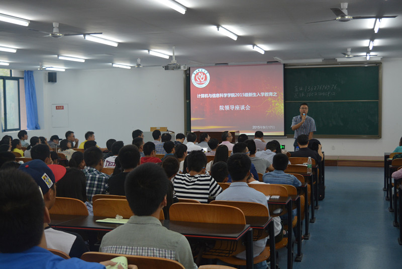 2015级新生入学教育之院领导座谈会,出席本次座谈会的嘉宾有院长魏延老师、党委书记刘军老师、党委副书记杨宇老师、学院办公室主任罗世祥老师、教学科研班主任祁相志老师、学院教学督导组组长唐万梅老师、学院工会主席李晓虹老师以及各系系主任、各级辅导员。