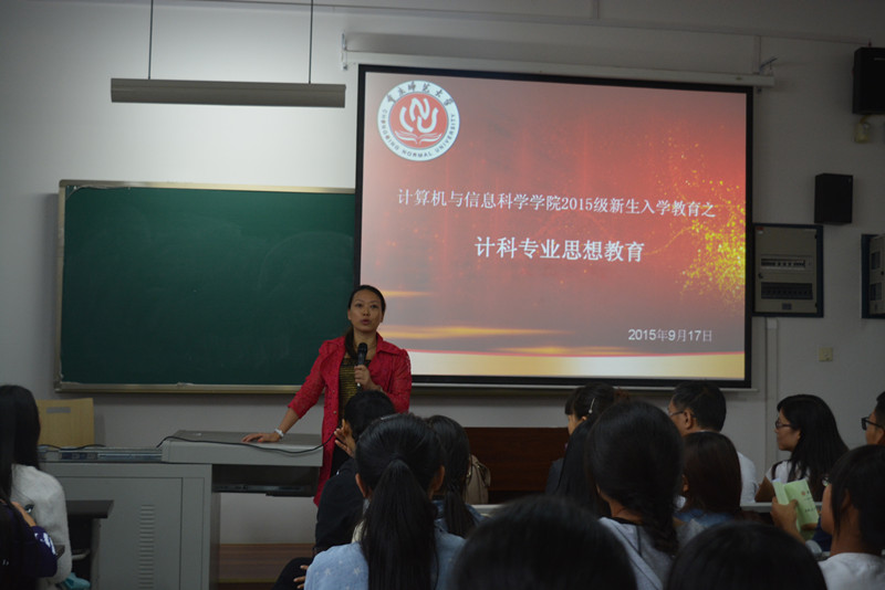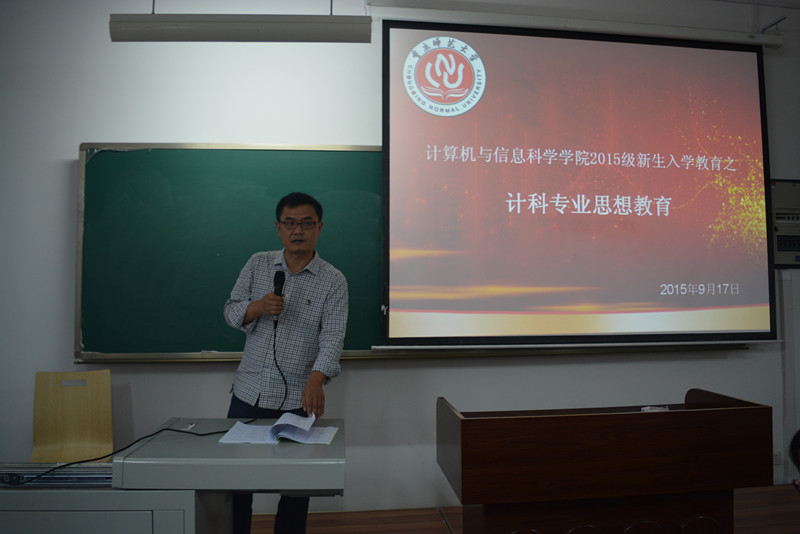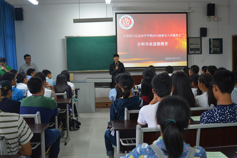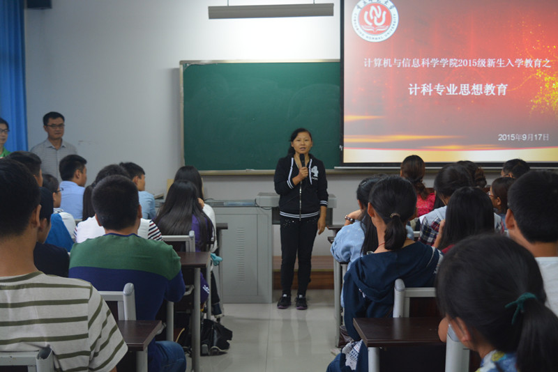 于2015年9月17日下午4时在图北楼、弘德楼多个教室召开“计信学院专业思想教育”为题的新生入学教育讲座,由各系系主任主讲,各专业相关教师均出席本次讲座。