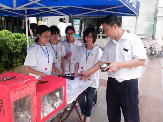 经过宣传部严密的策划,得到审批过后,办公室成员积极准备物资,并通知安排通志愿者排好班。在活动前期,我们对捐款时的礼仪进行了培训,提升社团的人文素养。接着于4月27、28日正式举行募捐活动,在一食堂、三食堂广场开设募捐点。首先社内人员积极布置场地,然后由值班人员在大本营分发宣传单,给同学们进行宣传。上课的同学也充分发挥自己的圈子,在教室里发出倡议、给朋友们积极宣传。当过往的同学了解到刘老师状况时候,都伸出了援助之手,一元、五元、十元、五十、一百元,同学们的爱心不断的充实着募捐箱。就连社会上的人士和食堂的大妈大叔们都慷慨解囊,而且还帮忙宣传。志愿者们顶着炎炎烈日,始终面带微笑,向献爱心的人一一答礼。