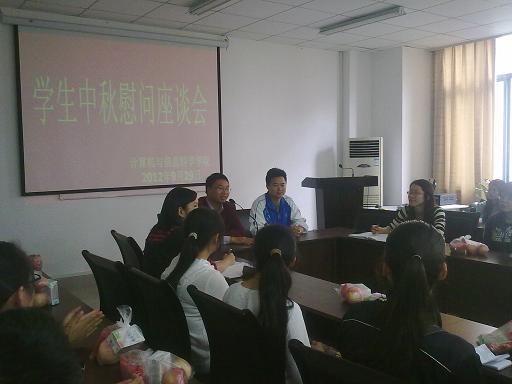 党总支副书记杨宇、团总支副书记张敬、11级辅导员孙柳艳、12级辅导员傅帆老师于2012年9月29日中午与30名各专业贫困学生代表在集贤楼233会议室度过了一个师生情浓的中秋节,而且学院还给同学们准备了丰厚的中秋节小礼物。