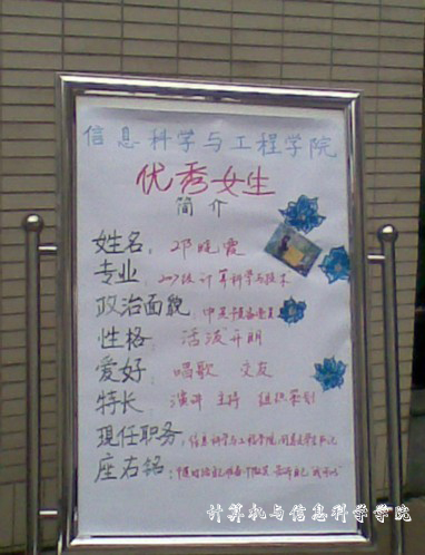 选出了两名既具有一定先进事迹和专业特长,又能突出学院风采的优秀女生,将她们的精彩事迹做成展板在弘徳楼中庭展出。浪live