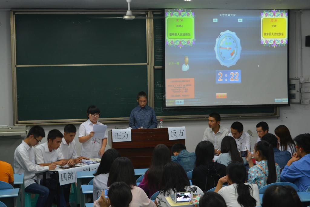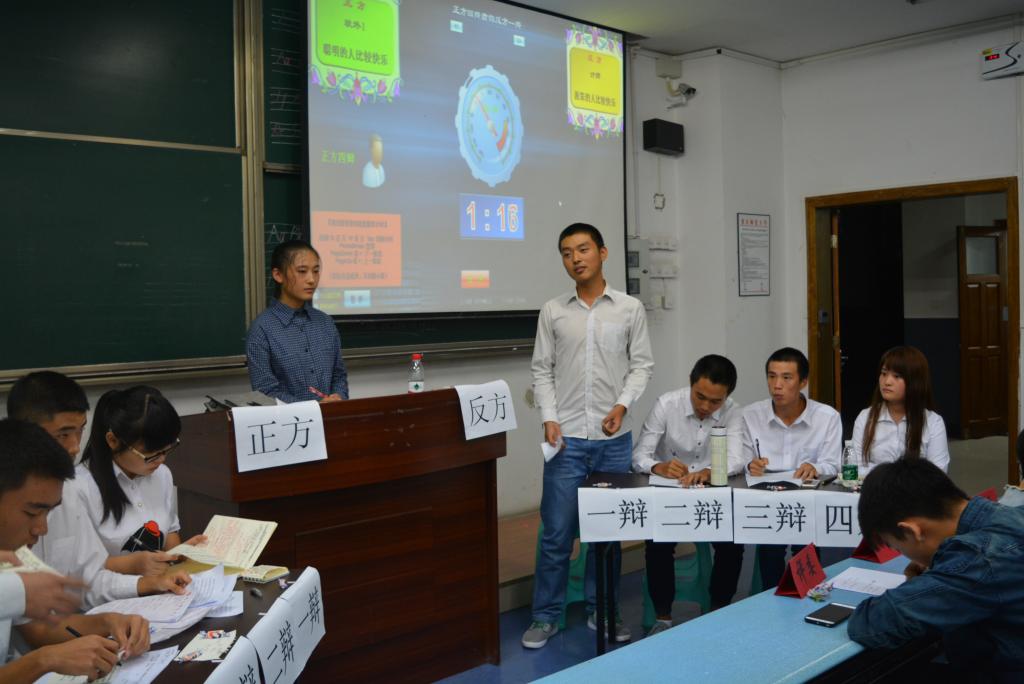 据悉辩论赛初赛分为两场,在两个班级开展。其中辩题为“聪明、愚蠢的人谁比较快乐”、“真话、谎言哪种伤害更大”、“奋斗路上,好伙伴、好对手哪个重要”、“知道的越多,越像世界的孤儿还是宠儿”。辩论赛在学习部成员的主持下,有次序的开展。过程中最引人注目的便是“知道越多,越向世界的孤儿还是宠儿”这一辩题,正方选手为信息管理与信息系统专业的四位同学,他们认为知道越多,越向世界的宠儿。这个韩寒曾说过的命题,引起正反方进行了激烈的辩论。针对每个论点,选手们都做了充分的赛前准备。辩手们在比赛中滔滔不绝地陈诉自己的观点,在攻辩阶段完整地展现了言语的犀利和思维的敏捷,不断抓住对方辩友提出的观点中的漏洞给予反击。场上不时传出幽默诙谐的语言,引得现场掌声不断,笑声和喝彩声不绝于耳。尽管正反输掉了比赛,但是他们的出色表现得到了评委们的充分肯定和观众们的认可并且正方三辩获得了最佳辩手称号。
