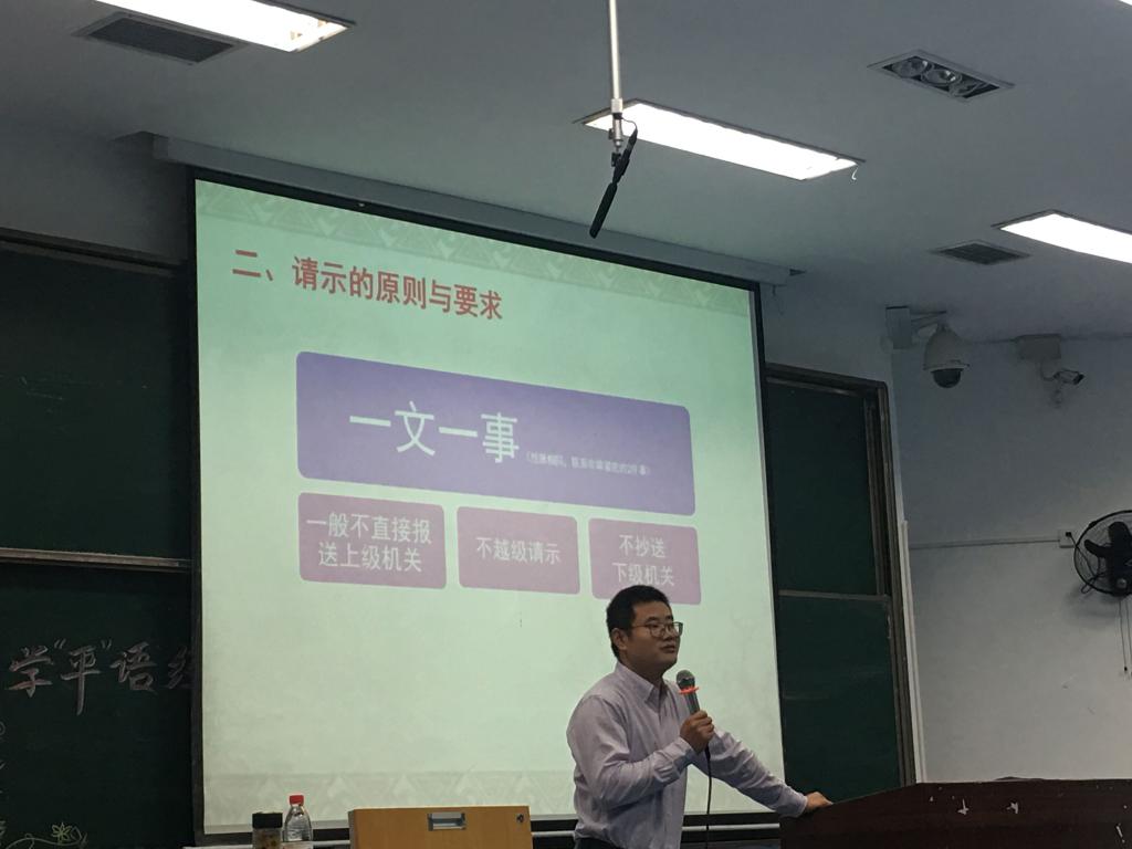 在团辅中,汤海鹏老师首先就公文写作的文化背景、思想高度、行文要求等进行了深入的分析,然后对请示公文、报告公文、纪要公文等具体的公文文种撰写进行了详细的辅导,让同学们充分了解了公文写作的规范和要义,如请示公文的“三不得”,工作报告、专题工作报告、情况报告、回复报告、报送报告的主干构成等,为同学们目前的生活工作和未来的公务员选拔打下了基础。最后,汤海鹏老师结合具体案例并剖析其优劣,帮助学生深入的理解和掌握公文写作,学院还将进行公文写作测试,对本次公文写作团辅进行再巩固。