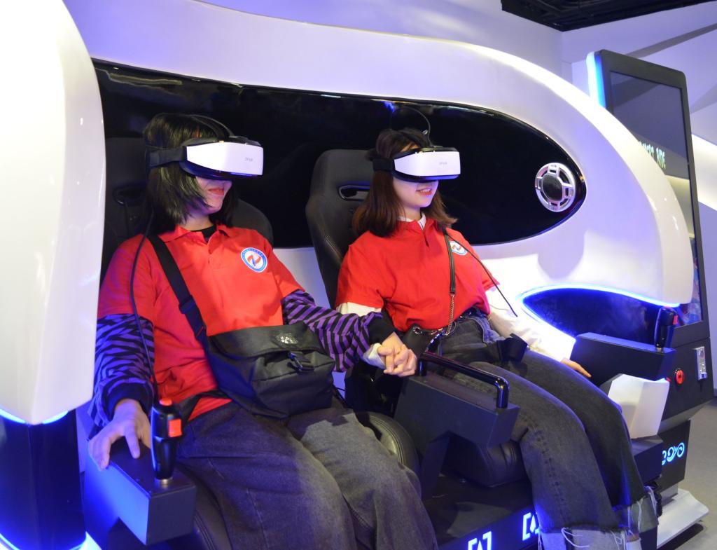 师生通过系统终端屏幕“刷脸”注册后,在参观体验园的同时,记录了运动的距离、消耗的热量等,并可以在终端屏幕上查询到这些数据及当日的运动排名。途中,讲解员向师生们介绍了沿途的智慧凉道体验区,体验区利用红外线和温度感应能自动进行喷雾降温,水雾从步道两侧喷出,形成了云雾缭绕的“人间仙境”。沿着智慧步道,师生们来到了5G智慧生活馆,相继体验了5G视频通话、VR虚拟驾驶、沉浸式自行车、机械臂打冰球、多人VR游戏、5G手机体验等互动项目,在体验的同时也感受到了5G给未来生活所带来的美好。