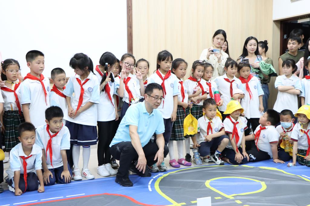 王军书记代表计信学院对附小师生表示热烈欢迎。观摩学习开始前,计信学院参会人员与附小师生一道在致用楼前合影留念。随后,小学生们欢呼雀跃、满怀好奇来到学院各试验基地。学院大厅中机器人闻令而动、翩翩起舞,整齐划一的跳着“科目三”,瞬间将全场氛围引燃,小学生们跟着手舞足蹈起来,被奇妙的人工智能设备和创新实验深深吸引。各实验室的负责老师分别为孩子们上了一堂精彩而实用的人工智能科普课,带领大家了解什么是人工智能,什么是机器人、人脑智能是怎样实现的、怎样训练人工智能、AI是怎样识别人脸和语言的、虚拟现实是什么样子的等一系列人工智能问题。同时,给小学生们讲解了全国机器人与人工智能大赛的综合技能挑战赛以及无人车自主驾驶的工作流程等信息。